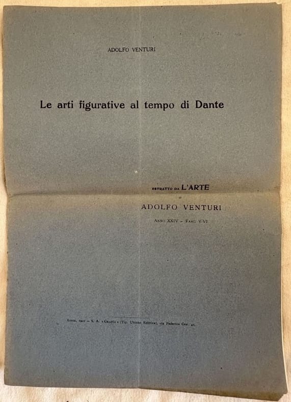 Interessante pubblicazione del 1921 sulle arti figurative al tempo di Dante di Adolfo Venturi. Estratto da l'Arte di Adolfo Venturi anno XXIV Fasc. V-VI. In buone condizioni. Copertina editoriale in buone condizioni generali con lievi usure ai margini e dorso. Legatura in buone condizioni. All'interno le pagine si presentano in buone condizioni con rare fioriture. Piegature. In folio. Dim. 33x24 cm. Pp. 8. Interesting pamphlet of 1921 about figurative arts during period of Dante by Adolfo Venturi. Extract from l'Arte by Adolfo Venturi year XXIV Fasc. V-VI. In good conditions. Editorial cover in good good general conditions lightly worn in the extremities. Binding in good conditions. Inside pages are in good conditions with occasional foxing. Folding. In folio. Dim. 33x24 cm. Pp. 8.