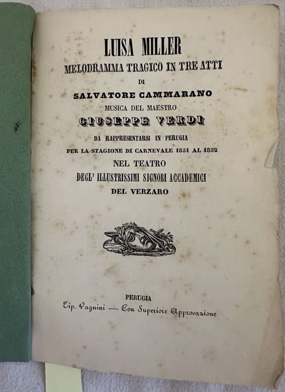 Libretto d'opera della celebre opera "Luisa Miller" musicata da Giuseppe Verdi (1813-1901) da rappresentarsi a Perugia nel Teatro del Verzaro durante il Carnevale 1851-1852. Libretto di Salvatore Cammarano. Senza data ma probabilmente pubblicato nel 1851 anno della rappresentazione a cui fa riferimento sul frontespizio. Lista degli attori (Giorgio Mirandola, Olivia Pavanni, Pastora Ercoli, Luigi Lolli, Apollinare Ortolani, Carolina Cuzzani, Ginevra Ferrattini, Gesualdo Berti). L'opera venne rappresentata per la prima volta l'8 dicembre 1849 al Teatro di San Carlo a Napoli. In ottime condizioni. Copertina morbida coeva in buone condizioni generali con lievi usure e mancanze ai margini e dorso coperto da carta. Legatura in buone condizioni. All'interno le pagine si presentano in buone condizioni con rare fioriture. In 8. Dim. 19x13 cm. Pp. 40.Booklet of the famous opera "Luisa Miller" music by Giuseppe Verdi (1813-1901) to be represented in Perugia in Teatro del Verzaro during Carnival 1851-1852. Booklet by Salvatore Cammarano. Not dated but probably published in 1851 year of the representation refeered in the title page. List of actors (Giorgio Mirandola, Olivia Pavanni, Pastora Ercoli, Luigi Lolli, Apollinare Ortolani, Carolina Cuzzani, Ginevra Ferrattini, Gesualdo Berti). The work was represented for the first time the 8th of december 1849 in Teatro di San Carlo in Naples. In very good conditions. Soft coeval cover in good general conditions lightly worn with lackings in the extremities. Spine covered by paper. Binding in good conditions. Inside pages are in good conditions with occasional foxing. In 8. Dim. 19x13 cm. Pp. 40.