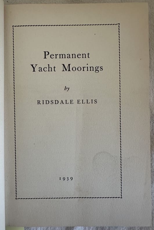Manuale del 1939 sugli ormeggi permanenti degli yacht a cura di Ridsdale Ellis. Alcune figure in bianco e nero. In ottime condizioni. Copertina editoriale con sovraccoperta in ottime condizioni generali con lievi usure ai margini e dorso. Legatura in buone condizioni. All'interno le pagine si presentano in ottime condizioni con rare fioriture. In 8. Dim. 19x13,5 cm. Pp. 117. Manual of 1939 about permanent yacht moorings by Ridsdale Ellis. Some black and white figures. In very good conditions. Editorial cover with dustjacket in very good good general conditions lightly worn in the extremities. Binding in good conditions. Inside pages are in very good conditions with occasional foxing. In 8. Dim. 19x13,5 cm. Pp. 117.