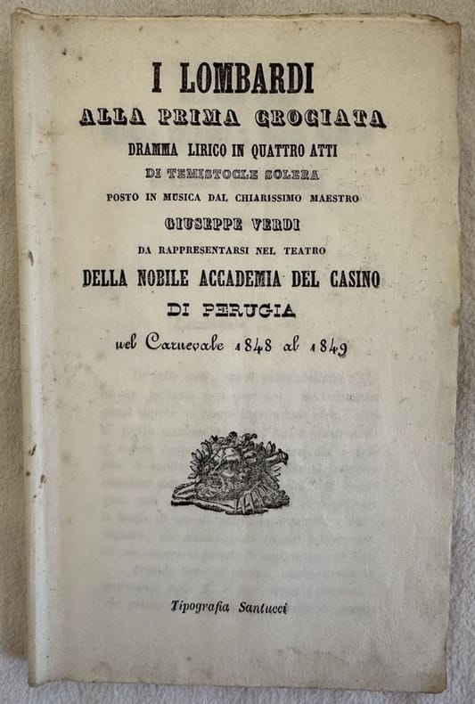 Libretto della libretto d'opera "I lombardi alla prima crociata" musicata da Giuseppe Verdi (1813-1901) da rappresentarsi a Perugia nella Nobile Accademia del casino di Perugia durante il Carnevale 1848-49. Libretto di Temistocle Solera. L'opera venne rappresentata per la prima volta l'11 febbraio 1843 al Teatro alla Scala di Milano. Senza data ma probabilmente pubblicato nel 1849 anno della rappresentazione a cui fa riferimento sul frontespizio. Lista degli attori (Gaetano Roberti, Alessandro Ottaviani, Benedetta Savorelli, Sofia Schoberlechner, Giuseppe Buranelli, Domenico Severini, Almena Sgaravizzi, Zenobio Bettini, Angelo Maraghini). Maestro concertatore Ulisse Corticelli; Direttore di orchestra Rinaldo Barbi. In buone condizioni. Copertina assente. Legatura in discrete condizioni con qualche rottura e pagina staccata. All'interno le pagine si presentano in buone condizioni con rare fioriture. In 8. cm 19x12. Pp. 32.Booklet of the famous opera "I Lombardi alla prima crociata" by the italian composer Giuseppe Verdi (1813-1901) to be represented in Perugia in Nobile Accademia del casino di Perugia during Carnival 1848-49. Booklet by Temistocle Solera. The work was represented for the first time the 11st of february 1843 in Teatro alla Scala of Milan. Not dated but probably published in 1849 year of the representation refeered in the title page. List of actors (Gaetano Roberti, Alessandro Ottaviani, Benedetta Savorelli, Sofia Schoberlechner, Giuseppe Buranelli, Domenico Severini, Almena Sgaravizzi, Zenobio Bettini, Angelo Maraghini). Maestro concertatore Ulisse Corticelli; Direttore di orchestra Rinaldo Barbi. In good conditions. Cover lacks. Binding in fair conditions with some cracks and page detached. Inside pages are in good conditions with occasional foxing. In 8. cm 19x12. Pp. 32.