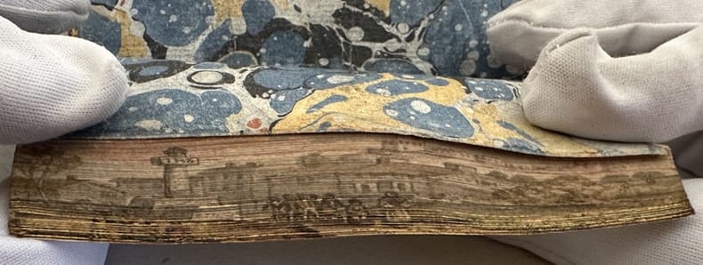 Edizione londinese del 1782 di questa raccolta di opere di Alexis Piron (1689-1773) poeta e drammaturgo francese. Definito da Saint-Beuve come la personificazione dell'allegria e del mimetismo, esercitò le sue doti di epigrammista mordace contro i letterati della sua epoca tra i quali Voltaire. L'opera è composta da tre tomi ed è completa. All'interno: Vita dell'autore, Epitres, allegories, Odes, Poemes, Fables, La metromanie, Poesies diverses, Chansons, Contes, Epigrammes etc.. Ma la verà particolarità di questo esemplare è il "fore-edge painting" o "disegno a scomparsa", un dipinto sul taglio delle pagine che appare solamente tenendo il blocco di pagine tra il pollice e il resto delle dira e piegandolo in modo da allargare leggermente il bordo. Da chiuso il volume sembra un normalissimo libro dai tagli dorati. Questo rende quest'opera unica. Questa tecnica era molto popolare verso il XVIII secolo per raggiungere il suo culmine fino all'inizio del XX secolo. Il disegno mostra un paesaggio animato con abitazioni, persone in cammino e greggi; un lago con persone che pescano. In ottime condizioni. Copertina in piena pelle coeva con titolo e decorazioni in oro al dorso in ottime condizioni generali con lievi usure ai margini e dorso. Legatura in buone condizioni. All'interno le pagine si presentano in ottime condizioni con rare fioriture. In 24. Dim. 12,5x8 cm. Pp. XII+180, (4)+196, (4)+168.London edition of 1782 of this collection of works by Alexis Piron (1689-1773) french poet and dramawriter. The work is made up of three tomes and it is complete. Inside: Vita dell'autore, Epitres, allegories, Odes, Poemes, Fables, La metromanie, Poesies diverses, Chansons, Contes, Epigrammes etc.. But the real particularity of this work is the "fore-edge painting", a painting that appears only with a folding of fore edges. When closed the book is a common tome. This makes this work a unique book. This technique was very popular duraing 18th century to reach its peak to the beginning of 20th century. The drawing represents an animated view with houses, people walking and cattle; a lake with people fishing. In very good conditions. Leather coeval cover with gilted title and decorations in the edges and spine in very good general conditions lightly worn in the extremities. Binding in good conditions. Inside pages are in very good conditions with occasional foxing. In 24. Dim. 12,5x8 cm. Pp. XII+180, (4)+196, (4)+168.
