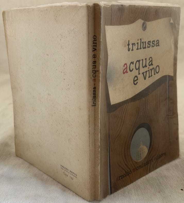 Seconda edizione del 1946 dell'opera "Acqua e vino" di Trilussa (1871-1950) pseudonimo di Carlo Alberto Camillo Mariano Salustri. Insieme al volume tre volantini pubblicitari su Trilussa e l'opera. Copertina editoriale illustrata. In buone condizioni. Copertina editoriale in buone condizioni generali con lievi usure ai margini e dorso. Legatura in buone condizioni. Pagine in buone condizioni con fioriture. In 8. Dim. 21x15,5 cm. Pp. 117+(3). Peso Kg. 0,142Second edition of 1946 of the work "Acqua e vino" by Trilussa (1871-1950) pseudonymous of Carlo Alberto Camillo Mariano Salustri. Editorial illustrated cover. In good conditions. Editorial cover in good general conditions lightly worn in the extremities. Binding in good conditions. Pages are in good conditions with foxing. In 8. Dim. 21x15,5 cm. Pp. 117+(3). Weight Kg. 0,142