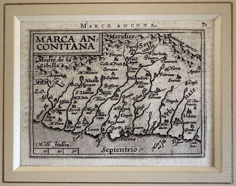 Mappa originale del 1601 del territorio di Ancona di Abraham Ortelius (1527-1598) montata su elegante passepartout. INCISIONE: Acquaforte su rame AUTORE: Abraham Ortelius (1527-1598) ATLANTE: Epitome theatri Orteliani - Antuerpiae, Joannem Bapt. Urientium DIMENSIONI PASSEPARTOUT: cm 23x26 DIMENSIONI INCISIONE: cm 9x12 EPOCA: 1601 CONDIZIONI: ottime condizioni Original map of 1601 of the territory of Ancona by Abraham Ortelius (1527-1598) mounted on an elegant passepartout. ENGRAVING: Copper etching AUTHOR: Abraham Ortelius (1527-1598) ATLAS: Epitome theatri Orteliani - Antuerpiae, Joannem Bapt. Urientium SIZE OF PASSEPARTOUT: cm 23x26 SIZE OF THE ENGRAVING: cm 9x12 PERIOD: 1601 CONDITIONS: very good conditions