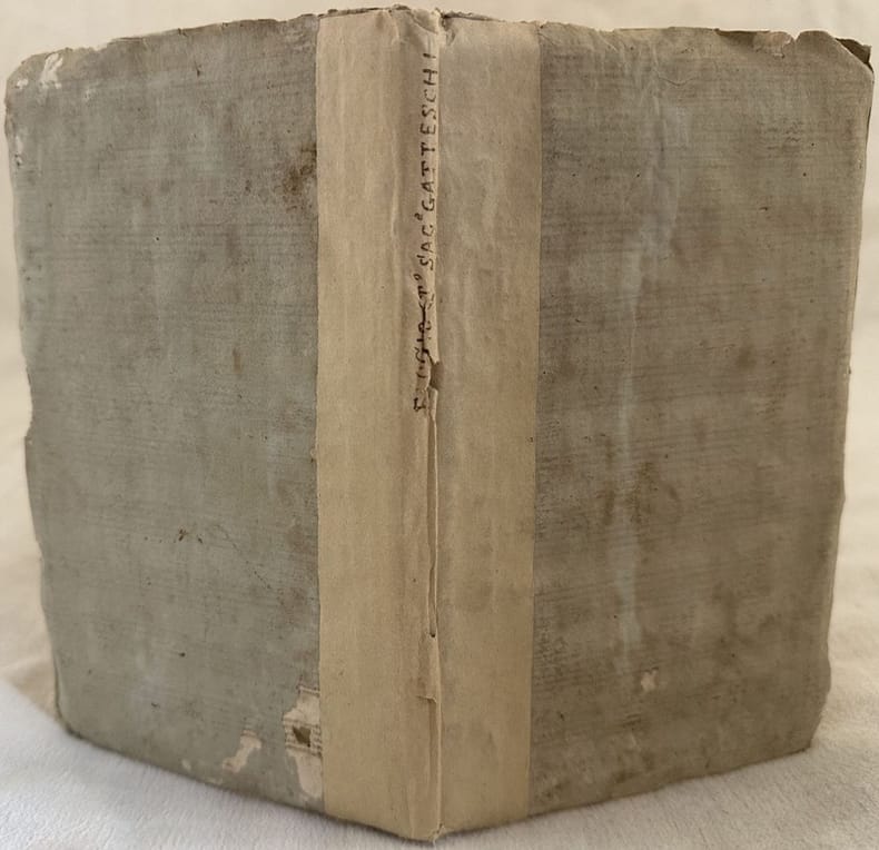 Rara opera del 1797, l'elogio del sacerdote Francesco Gatteschi (1716-1796) da Pieve di San Martino a Vado (Arezzo). Dedica al fratello Cristofano Gatteschi. L'opera è in un volume ed è completa. In buone condizioni. Copertina cartonata coeva con titolo manoscritto al dorso in buone condizioni generali con usure e mancanze ai margini e dorso. Legatura in buone condizioni con lievi rotture. All'interno le pagine si presentano in buone condizioni con rare fioriture. In 16. cm 18x11,5. Pp. 63+(1).Scarce work of 1797, the ode of the priest Francesco Gatteschi (1716-1796) from Pieve di San Martino a Vado (Arezzo). Dedication to his brother Cristofano Gatteschi. The work is in one volume and it is complete. In good conditions. Carton coeval cover with handwritten title in the spine in good conditions lightly worn in the extremities. Binding in good conditions with light cracks. Pages in good conditions with occasional foxing. In 16. cm 18x11,5. Pp. 63+(1).