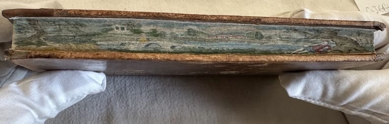 Edizione del 1810 di questa raccolta di fiabe di John Gay (1685-1732) poeta e drammaturgo inglese. All'interno numerose incisioni nel testo. Una tavola in antiporta. Ma la verà particolarità di questo esemplare è il "fore-edge painting" o "disegno a scomparsa", un dipinto sul taglio delle pagine. Questo lo rende quest'opera unica. Questa tecnica era molto popolare verso il XVIII secolo per raggiungere il suo culmine fino all'inizio del XX secolo. Il disegno mostra un paesaggio bucolico animato con abitazioni, un fiume con un ponte e una persona sulla riva del fiume. Dedica datata 1844 alla carta di dedica. In ottime condizioni. Copertina in piena pelle coeva con titolo a secco al dorso in buone condizioni generali con lievi usure ai margini e dorso. Legatura in buone condizioni. All'interno le pagine si presentano in ottime condizioni con rare fioriture. In 16. Dim. 17,5x11 cm. Pp. 252.Edition of 1810 of this collection of tales by Alexis Piron (1689-1773) english poet and dramawriter. Inside different engravings in the text. A plate in the frontspice. But the real particularity of this work is the "fore-edge painting". This makes this work a unique book. This technique was very popular during 18th century to reach its peak to the beginning of 20th century. The drawing represents an animated view with houses, a river with a bridge, a person relaxing in the side of the river. Dedication dated 1844 in the dedication page. In very good conditions. Leather coeval cover with embossed title in the spine in good general conditions lightly worn in the extremities. Binding in good conditions. Inside pages are in very good conditions with occasional foxing. In 16. Dim. 17,5x11 cm. Pp. 252.