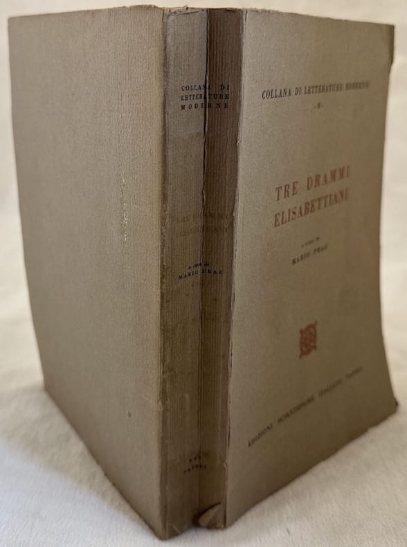 Edizione del 1958 di questo studio su tre drammi elisabettiani a cura di Mario Praz della serie "Colana di letterature moderne". All'ìinterno: Il teatro elisabettiano; La tradizione di Seneca; La leggenda di Machiavelli; Beaumont e fletcher; John Webster; John Ford ecc... Sottolineature a matita e matita colorata. Firma all'occhietto. In buone condizioni. Copertina editoriale in discrete condizioni generali con lievi usure e mancanze ai margini e dorso. Legatura in discrete condizioni con lievi rotture. All'interno le pagine si presentano in buone condizioni con rare fioriture. In 8. Dim. 22x14,5 cm. Pp. (6)+492+(6).Edition of 1958 of this study about three Elizabeth dramas written by Mario Praz of the series "Colana di letterature moderne". All'ìinterno: Il teatro elisabettiano; La tradizione di Seneca; La leggenda di Machiavelli; Beaumont e fletcher; John Webster; John Ford ecc... Underlinings with pencil and coloured pencil. In good conditions. Editorial cover in fair general conditions lightly worn in the extremities. Binding in fair conditions with light cracks. Inside pages are in good conditions with occasional foxing. In 8. Dim. 22x14,5 cm. Pp. (6)+492+(6).