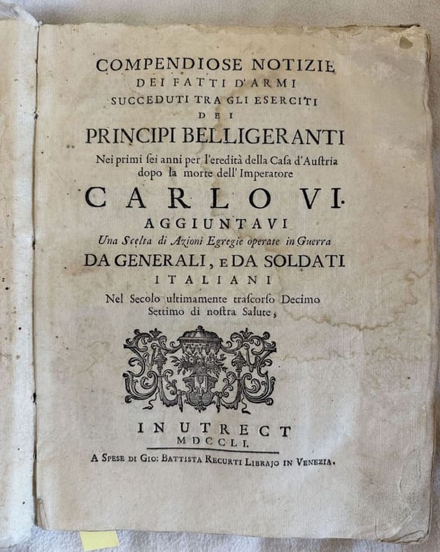 Edizione del 1751 di questa opera sulla Guerra di Successione d'Austria. Il volume prende in considerazione il periodo dal 1740 al 1746. All'interno; Campagna di Slesia in Germania; Coronazione della Regina in Sovrana d'Ungheria; Campagna d'Austria e di Boemia in Germania; Campagnia d'Italia; Campagna di Savoja; Coronazione della Regina in Boemia; di Baviera in Germania; Campagna del Reno in Germania; Campagna sull'Alpi in Piemonte; Campagna sul Modonese in Italia; in Fiandra; sul Reno in Germania; Alta Alemagna; Assedio di Friburg; Campagna dei Paesi Bassi; Campagna di Piemonte; Morte dell'Imperatore Carlo VII; Elezione dell'Imperatore Francesco I; Campagna di Lombardia; Campagna di Paesi Bassi; Campagna di Slesia e di Boemia in Germania; Campagna di Lombardia; Battaglie di Piacenza e di Rottolma; Campagna sul Genovesato ecc.. In ottime condizioni. Copertina in cartonato coevo in buone condizioni generali con lievi usure ai margini e dorso. Legatura in discrete condizioni con lievi rotture. All'interno le pagine si presentano in buone condizioni con rare fioriture. In 8. Dim. 24,5x18,5 cm. Pp. (4)+300.Edition of 1751 of this work about Guerra di Successione of Austria. The volume takes in consideration the period from 1740 to 1746. Inside; Campagna di Slesia in Germania; Coronazione della Regina in Sovrana d'Ungheria; Campagna d'Austria e di Boemia in Germania; Campagnia d'Italia; Campagna di Savoja; Coronazione della Regina in Boemia; di Baviera in Germania; Campagna del Reno in Germania; Campagna sull'Alpi in Piemonte; Campagna sul Modonese in Italia; in Fiandra; sul Reno in Germania; Alta Alemagna; Assedio di Friburg; Campagna dei Paesi Bassi; Campagna di Piemonte; Morte dell'Imperatore Carlo VII; Elezione dell'Imperatore Francesco I; Campagna di Lombardia; Campagna di Paesi Bassi; Campagna di Slesia e di Boemia in Germania; Campagna di Lombardia; Battaglie di Piacenza e di Rottolma; Campagna sul Genovesato ecc.. In very good conditions. Carton coeval cover in good general conditions lightly worn in the extremities. Binding in fair conditions with light cracks. Inside pages are in good conditions with occasional foxing. In 8. Dim. 24,5x18,5 cm. Pp. (4)+300.<BR><BR>