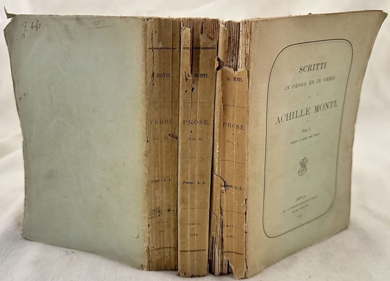 Edizione del 1882 di questa raccolta di scritti e prosa e in versi di Achille Monti. L'opera è composta da tre volumi ed è completa. In discrete condizioni. Copertina editoriale in discrete condizioni con lievi usure ai margini e dorso. Legatura in discrete condizioni. Pagine in buone condizioni con fioriture. In 8. cm. 19x13. Pp. XXVI+342, 352, 360.Edition of 1882 of this collection of writings and prose in verses by Achille Monti. The work is made up of three tomes and it is complete. In fair conditions. Editorial cover in fair conditions lightly worn in the extremities. Binding in fair conditions. Pages in good conditions with foxing. In 8. cm. 19x13. Pp. XXVI+342, 352, 360.
