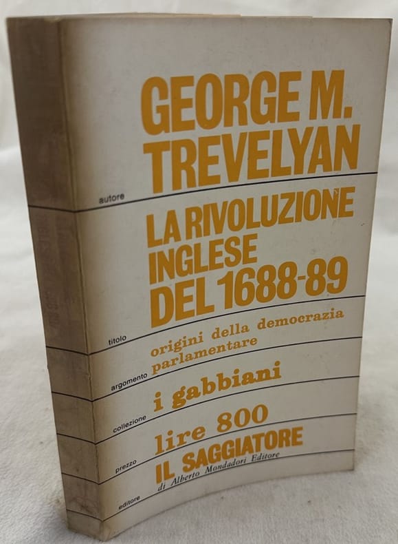 Edizione del 1968 di questa opera sulla Rivoluzione inglese del 1688-89 di George Macaulay Trevelyan della collana "Il Saggiatore". Traduzione di Cesare Pavese. In ottime condizioni Copertina editoriale in buone condizioni generali con lievi usure ai margini e dorso. Macchie. Legatura in buone condizioni. All'interno le pagine si presentano in ottime condizioni con rare fioriture. In 16. Dim. 18x11,5 cm. Pp. 190+(10). Edition of 1968 of this work about english Revolution of 1688-89 by George Macaulay Trevelyan of the series "Il Saggiatore". Translation by Cesare Pavese. In very good conditions. Editorial cover in good general conditions lightly worn in the extremities. Stains. Binding in good conditions. Inside pages are in very good conditions with occasional foxing. In 16. Dim. 18x11,5 cm. Pp. 190+(10).