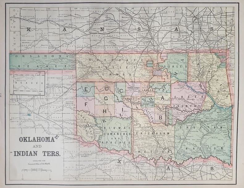 Bellissima mappa colorata dell'Oklahoma nel territorio indiano. Al verso mappa colorata di Atlanta e Charleston. Autore: George F. Cram Atlante: Standard American atlas of the world Data: 1890 circa Tecnica: litografia Dimensione del foglio: 36,5x29 cm Dimensione dell'incisione: 33x26 cm Condizioni:Buone. Alcune gore di umidità marginali.Very beautiful page coloured map of Oklahoma in indian territory. In the verso coloured map of Atlanta and Charleston. Author: George F. Cram Atlas: Standard American atlas of the world Date: 1890 circa Technique: lythography Leaf Dimension: 36,5x29 cm Engraving Dimension: 33x26 cm Conditions: Good conditions. Some little water stains in the edges.<BR><BR>
