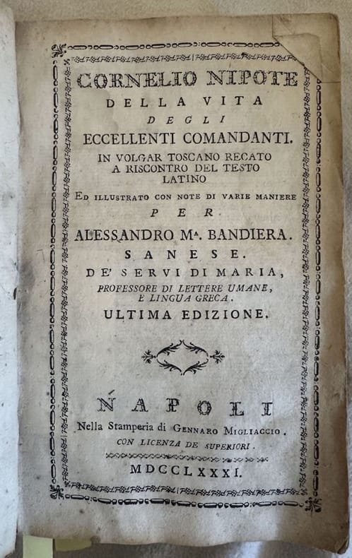 Bella edizione del 1781 della celebre opera classica "De viris illustribus" di Cornelio Nepote. Lo scritto è una raccolta di biografie di condottieri stranieri. Testo italiano con note a cura di Alessandro Bandiera. All'inizio raffronto della traduzione di Jacopo Nardi e dell'autore. All'interno sono presenti due planches ripiegate di tabelle. Antica nota manoscritta alla prima carta bianca datata 1788. In discrete condizioni. Copertina in piena pergamena coeva con titolo manoscritto al dorso in discrete condizioni generali con lievi usure ai margini e dorso. Legatura in discrete condizioni ma corpo del libro in parte staccato. All'interno le pagine si presentano in buone condizioni con fioriture. Qualche lieve gora d'umidità. Alcune usure al margine destro da pag. 447 alla fine senza perdita di testo. In 16. cm 18x11. Pp. 454+2 pl.Beautiful edition of 1781 of the famous classical work "De viris illustribus" written by Cornelio Nepote. The writing is a collection of biographies of stranger commanders. Latin text with notes by Alessandro Bandiera. At the beginning comparison of the translation by Jacopo Nardi and the author. Two folded planches of charts. Antique handwritten note in the first page dated 1788. In fair conditions. Full parchment coeval cover with handwritten title in the spine in fair general conditions lightly worn in the extremities. Binding in fair conditions but the body of the book partially detached. Inside pages are in good conditions with foxing. Some light dump stain. Some wearings in the right edge from pag. 447 to the end with no loss of text. In 16. cm 18x11. Pp. 454+2 pl.