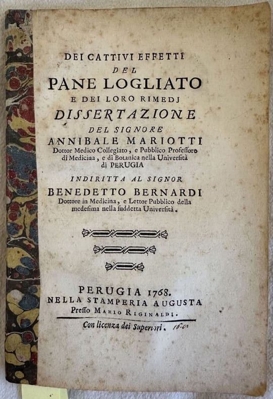 Rara opera del medico e poeta perugino Annibale Mariotti (Perugia, 1738 - Perugia, 1801) indirizzata a Benedetto Bernardi. Mariotti diede un notevole contributo allo sviluppo culturale della sua città e pubblicò numerosi trattati medici e botanici entrando in contatto con tutti i protagonisti di spicco del movimento scientifico nazionale del tempo. L'opera è una dissertazione sui cattivi effetti del pane di loglio generalmente acquistato dalle classi povere; egli descrive gli effetti inebrianti della sostanza contenuta nel loglio assimilandoli a quelli dell'oppio e fornisce i rimedi. Numerosi gli autori citati nel volume: Malpighi, Galeno, Lapi, Ramazzini, Mead, Buffon, Bradley, Tillet ecc.. In buone condizioni. Copertina assente. Legatura in discrete condizioni con qualche lieve rottura. Pagine in buone condizioni con fioriture. In 16. Dim. 17,5x12. Pp. VIII+79+1. Scarce work by the poet and physician from Perugia Annibale Mariotti (Perugia, 1738 - Perugia, 1801) addressed to Benedetto Bernardi. Mariotti gave an important contribute to the culture innovation of its city. He wrote different treaties entering in touch wiuth the most important people of his time. The work is a dissertation about the bad effects of ryegrass bread generally used by poor people. he describes the effects similar to opium and the remedies for that. Different authors cited in the volume: Malpighi, Galeno, Lapi, Ramazzini, Mead, Buffon, Bradley, Tillet ecc.. In good conditions Cover lacks. Binding in fair conditions with light cracks. Pages in good conditions with foxing. In 16. Dim. 17,5x12. Pp. VIII+79+1.
