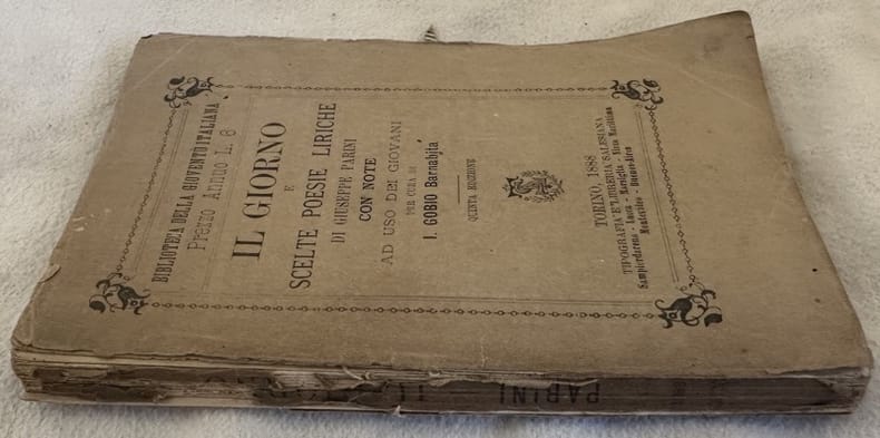 Edizione del 1888 di questa raccolta di opere di Giuseppe Parini (1729-1799) poeta, librettista e traduttore italiano della collana "Biblioteca della gioventù italiana". Parini è uno dei massimi esponenti del Neoclassicismo e dell'Illuminismo italiano. All'interno l'opera "il giorno", una scelta di poesie liriche, sonetti, versi sciolti, rime piacevoli, poesie varie. Note a cura di I. Gobio Barnabita. In discrete condizioni. Copertina morbida in discrete condizioni generali con lievi usure ai margini e dorso. Legatura in discrete condizioni con lievi rotture. All'interno le pagine si presentano in buone condizioni con rare fioriture. In 16. cm 14,5x9,5. Pp. 224.Edition of 1888 of this collection by Giuseppe Parini (1729-1799) italian poet, booklet writer and translator of the series "Biblioteca della gioventù italiana". Parini was one of the most important exponent of italian Neoclassicism and illuminism. Insdie the work "il giorno", a choice of lyric poems, sonnets, verses, rhymes, poems. Notes by I. Gobio Barnabita. In fair conditions Soft cover in fair general conditions lightly worn in the extremities. Binding in fair conditions with light cracks. Inside pages are in good conditions with occasional foxing. In 16. cm 14,5x9,5. Pp. 224.