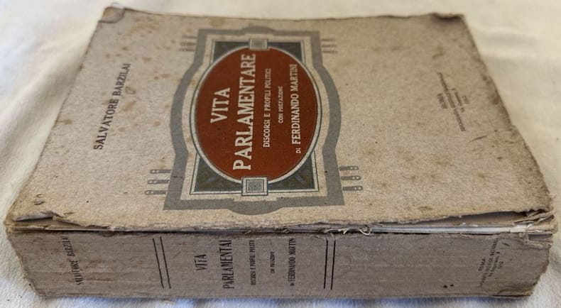 Edizione del 1912 di questo interessante scritto politico del politico e giornalista Salvatore Barzilai (1860-1939) sulla vita parlamentare. Prefazione di Ferdinando Martini. All'interno: Profili (Depretis, Crispi, Cairoli, Baccarini, Bonghi, Farini, Biancheri, Fortis, Coccapieller, Nicotera, Zanardelli, Codronchi, Coppino, Cavallotti, Magliani, Bovio, Ferri, Di Rudinì, Grimaldi, Taiani, Miceli ecc..), Discorsi (Crispi e la politica ecclesiastica, il primo Gabinetto Pelloux, Pelloux e l'ostruzionismo parlamentare; Il Ministero Saracco; Zanardelli e lo sciopero ferroviario; Il Secondo Gabinetto Giolitti e Repubblicani; Il Gabinetto interinale Tittoni; Il secondo Gabinetto Giolitti e Repubblicani; i secondo gabinetto Fortis; Giolitti e le elezioni; Il secondo Gabinetto Sonnino; Il Gabinetto Luzzatti ecc..).. In discrete condizioni Copertina editoriale in discrete condizioni generali con usure ai margini e dorso. Piatto anteriore staccato. Legatura in mediocri condizioni con rotture. All'interno le pagine si presentano in buone condizioni con rare fioriture. In 8. Dim. 22,5x15,5 cm. Pp. VIII+468. Edition of 1912 of this interesting political writing by the journalist and politician Salvatore Barzilai (1860-1939). Prefation by Ferdinando Martini. Inside: Profiles (Depretis, Crispi, Cairoli, Baccarini, Bonghi, Farini, Biancheri, Fortis, Coccapieller, Nicotera, Zanardelli, Codronchi, Coppino, Cavallotti, Magliani, Bovio, Ferri, Di Rudinì, Grimaldi, Taiani, Miceli ecc..), Speeches (Crispi e la politica ecclesiastica, il primo Gabinetto Pelloux, Pelloux e l'ostruzionismo parlamentare; Il Ministero Saracco; Zanardelli e lo sciopero ferroviario; Il Secondo Gabinetto Giolitti e Repubblicani; Il Gabinetto interinale Tittoni; Il secondo Gabinetto Giolitti e Repubblicani; i secondo gabinetto Fortis; Giolitti e le elezioni; Il secondo Gabinetto Sonnino; Il Gabinetto Luzzatti ecc..).. In fair conditions. Editorial cover in fair conditions lightly worn in the extremities. Front plate detached. Binding in poor conditions with cracks. Inside pages are in good conditions with occasional foxings. In 8. Dim. 22,5x15,5 cm. Pp. VIII+468.