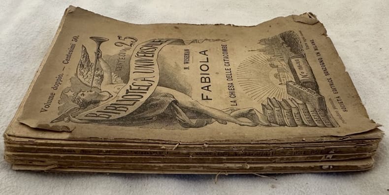 Edizione del 1904 di questo romanzo storico scritto da Nicholas Wiseman (1802-1865) della collana "Biblioteca Universale". L'opera fu composta con l'intento di sensibilizzare alla fede cattolica i lettori, in particolar modo quelli di cultura inglese. L'opera è composta da due volumi ed è completa. In discrete condizioni. Copertina editoriale in discrete condizioni con lievi usure ai margini e dorso. Piatto anteriore in parte staccato. Legatura in discrete condizioni. Pagine in buone condizioni con fioriture. In 16. cm. 17x11,5. Pp. 304.Edition of 1904 of this historical novel written by Nicholas Wiseman (1802-1865) of the series "Biblioteca Universale". The work was made up with the aim to sesibilize to the catholic faith the readers, particularly that of english culture. The work is in one volume and it is complete. In fair conditions. Editorial cover in fair conditions lightly worn in the extremities. Front plate partially detached. Binding in fair conditions. Pages in good conditions with foxing. In 16. cm. 17x11,5. Pp. 304.
