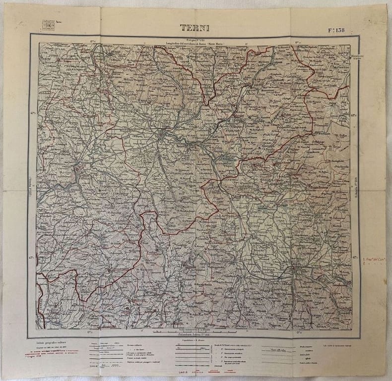 Carta geografica del 1943 di Caulonia. Mappa elaborata nel 1896 ma qui ristampata nel 1943 con dicitura "annullato" Al verso mappa di Terni compilato nel 1895 dai rilievi del 1893 e del 1936. Edizione del 1943. Di grandi dimensioni. TECNICA: Litografia AUTORE: Istituto Geografico Militare DIMENSIONI FOGLIO: cm 48,5x50 DIMENSIONI INCISIONE: cm 37,5x46,5 EPOCA: 1943 In buone condizioni. Fioriture. Map of 1943 of Caulonia. Map elaborated in 1896 but here republished in 1943 with writing "erased". In the verso map of Terni written in 1895 from reliefs of 1893 and 1936. Edition of 1943. Of big size. TECHNIQUE: Lythography AUTORE: Istituto Geografico Militare PAGE SIZE: cm 48,5x50 PRINT'S SIZE: cm 37,5x46,5 PERIOD: 1943 In good conditions. Foxing.