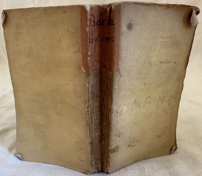 Edizione del 1821 di questa grammatica della lingua inglese di Edward Barker Carmelitano Scalzo della provincia di Toscana. All'interno grammatica, Vocabolario, Frasi familiari, Dialoghi. In discrete condizioni. Copertina morbida con titolo manoscritto al dorso in discrete condizioni generali con lievi usure ai margini e dorso. Legatura in discrete condizioni con lievi rotture. All'interno le pagine si presentano in buone condizioni con rare fioriture. In barbe. In 16. cm 16,5x10. Pp. 326.Edition of 1821 of this grammar of english language by Edward Barker Carmelitano Scalzo of the Province of Toscana. Inside grammar, Vocabulary, Family sentences, Dialogues. In fair conditions Soft cover with handwritten title in the spine in fair general conditions lightly worn in the extremities. Binding in fair conditions with light cracks. Inside pages are in good conditions with occasional foxing. Uncut copy. In 16. cm 16,5x10. Pp. 326.