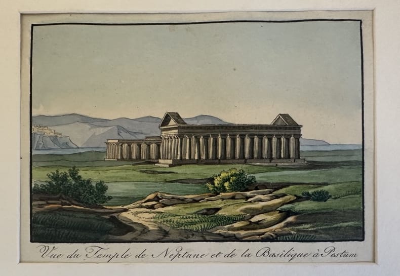 Piccola veduta colorata a mano del tempio di Nettuno a Paestum del 1850 circa. L'incisione è montata su passepartout. Autore: Anonimo Data: 1850 circa Tecnica: acquaforte Dimensione del passepartout: 240x180 mm Dimensione incisione: 85x120 mm Condizioni: Buone. Rare fioriture. Little view colored by hand of the Temple of Nettuno in Paestum of 1850 circa. The print is mounted in a passepartout. Author: Anonymous Date: 1850 circa Technique: etching Leaf Dimension: 240x180 mm Engraving Dimension: 85x120 mm Conditions: Good conditions. Occasional foxing.