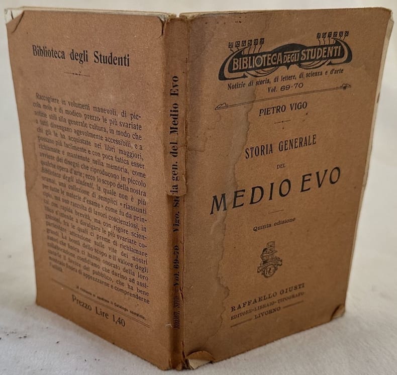 Edizione del 1915 di questa opera sulla storia del Medioevo a cura di Pietro Vigo della collana "Biblioteca degli studenti". In discrete condizioni. Copertina editoriale in discrete condizioni generali con lievi usure ai margini e dorso. Copertina in parte staccata. Legatura in discrete condizioni con rotture. All'interno le pagine si presentano in buone condizioni con rare fioriture. Lievi gore d'umidità. In 16. cm. 16x10,5. Pp. (10)+180.Edition of 1915 of this work about the history of Middleage written by Pietro Vigo of the series "Biblioteca degli studenti". In fair conditions. Editorial cover in fair general conditions lightly worn in the extremities. Cover partially detached. Binding in fair conditions with light cracks. Inside pages are in good conditions with occasional foxing. Light dump stains. In 16. cm. 16x10,5. Pp. (10)+180.