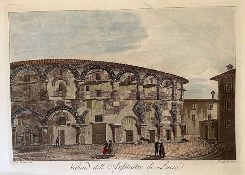 Veduta animata del 1801 dell'Anfiteatro di Lucca. Testo in lingua italiana "Acquatinta, disegnata dal Terreni, del quale si Hanno poche note ma è molto probabile che fosse un parente de Giuseppe Maria Terreni (1739-1811), native of Livorno e attivo a Firenze, celebrato vedutista" (Cfr. Brunet II, 1330; Graesse II, 611) Di grandi dimensioni. Atlante: "Viaggio pittorico della Toscana", Firenze Giuseppe Tofani Autore: Giuseppe Pera su disegno di Antonio Terreni Data: 1801 Tecnica: acquatinta colorata a mano Dimensione del foglio: 425x338 mm Dimensione incisione: 360x265 mm Condizioni: Buone. Rare fioriture.Very fine animated view of 1801 of the Anfiteatro of Lucca. Of big size "Acquatinta, disegnata dal Terreni, del quale si Hanno poche note ma è molto probabile che fosse un parente de Giuseppe Maria Terreni (1739-1811), native of Livorno e attivo a Firenze, celebrato vedutista" (Cfr. Brunet II, 1330; Graesse II, 611) Atlas: "Viaggio pittorico della Toscana", Firenze Giuseppe Tofani Author:Giuseppe Pera after Antonio Terreni Date: 1801 Technique: acquatinct coloured by hand Leaf Dimension: 425x338 mm Engraving Dimension: 360x265 mm Conditions: Good conditions. Occasional foxing.