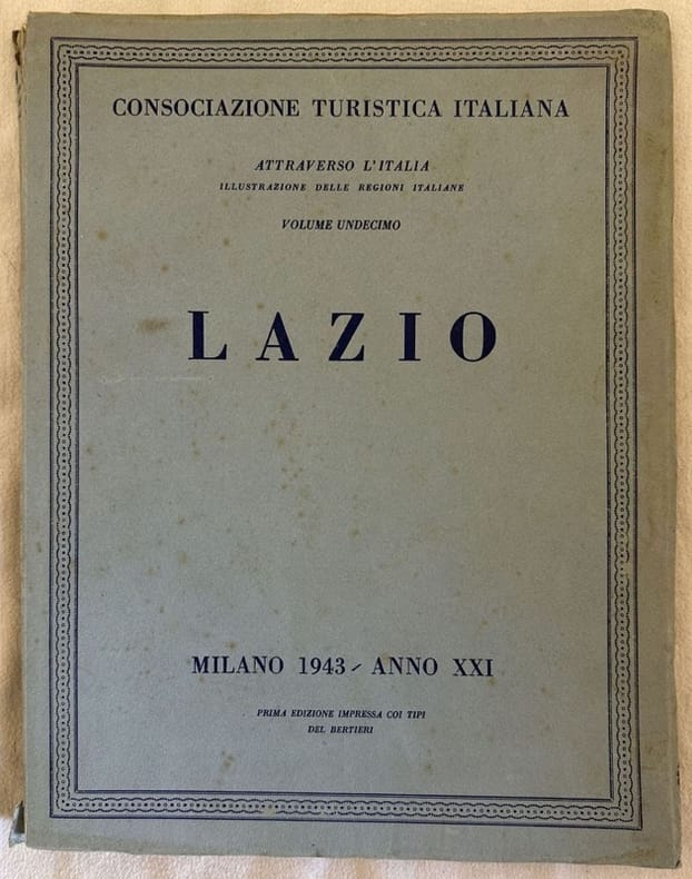 Edizione del 1943 di questa opera edita dal Touring club italiano sulla regione Lazio. L'opera è in un volume ed è completa. All'interno: Tivoli, Guidonia, Palombara Sabina, Riofreddo, Arsoli, Anticoli Corrado, Subiaco, Monte Autore, Palestrina, Frascati, Grottaferrata, Castel Gandolfo, Marino, Albano Laziale, Genzano, Ariccia, Monte Cave, Velletri, Valmontone, Nettunia, Fiumicino, Magliana, Fregene, Cerveteri, Maccarese, Civitavecchia, Bagni di Stigliano, Bracciano, Canale Monterano, Vicarello, Magliano Romano, Monterotondo, Mentana, Casale dei Pazzi, Viterbo, Tarquinia, Barbarano, Norchia, Tuscania, Canino, Vulci, Bolsena, Acquapendente, Civita, Montefiascone, Rieti, Terminillo, Cantalupo in Sabina, Poggio Mirteto, Antrodoco, Amatrice, Accumoli, Littoria, Paludi Pontine, Aprilia, Sabaudia, Terracina, Feronia, Sperlonga, Gaeta, Minturno, Itri, Fondi, Fossanova, Sezze, Sermoneta, Valvisciolo, Ninfa, Norba, Cori, Frosinone, Anagni Ferentino, Montecassino ecc.. Numerose fotografie in bianco e nero e qualcuna a colori mostrano diverse vedute e panorami. Una mappa del Lazio. In buone condizioni Copertina editoriale in buone condizioni generali con lievi usure ai margini e dorso. Legatura in buone condizioni. All'interno le pagine si presentano in buone condizioni con rare fioriture. Alcune usure marginali.Strappo a pag. 43. In 4. Dim. 29x22 cm. Pp. 237+(3)Edition of 1934 of this work edited by Touring club italiano about the region of Tuscany. The work is made up of two volumes and it is complete. Inside: Firenze, Fiesole, Vincigliata, Settignano, San Salvi, Villa della Petraia, Careggi, Doccia, Pratolino, Certosa, Monte Senario, Impruneta, Poggioa Caiano, Badia a sEttimo, Signa, Capraia, Montelupo, Empoli, Cartaldo, San Casciano, Montegufoni, Chianti Firoentino, Vallombrosa, Greve, Vallombrosa, La consuma, Gaville, Pieve di Cascia, Reggello, Prato, Pistoia, Pracchia, Pavana, Maresca, Cutigliano, Abetone, Montecatini, Massa Cararra, Pontremoli, Fivizzano, Vendaso, Alpi apuane, Lucchesia Versilia Garfagnana, Lucca, Pietrasanta, Pisa e provincia, Vicopisano, Buti, Cascina, Lorenzana, Volterra, Livorno, Castiglioncello, RosignanoCecina, Bolgheri, Populonia, Sassetta, Campiglia Marittima, Rio MArina, Portoferraio, Grosseto, Massa Marittima, monte Amiata, Sovana, Orbetello, Siena, Arezzo ecc... One map of Lazio. Inside there are different black and white and coloured photoes. In good conditions. Editorial cover in good conditions lightly worn in the extremities. Binding in fair conditions with light cracks. Inside pages are in good conditions with occasional foxing. In 4. Dim. 29x22 cm. Pp. 237+(3)<BR>
