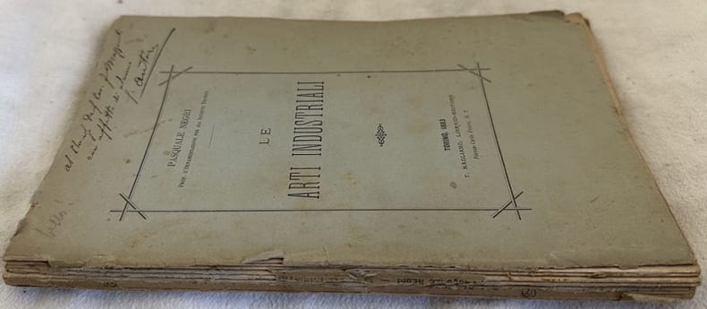 Edizione del 1883 di questa opera sulle arti industriali di Pasquale Negri. All'interno: Condizione dell'arte industriale nell'antichità e ai giorni nostri; Origine di quest'arte e suo sviluppo nella antichità nel Medio Evo e nell'epoca moderna; Considerazioni sull'arte industriale moderna e conclusione ecc.. Dedica autografa dell'autore in copertina senza firma In mediocri condizioni. Copertina editoriale in discrete condizioni generali con lievi usure ai margini e dorso. Legatura in mediocri condizioni. All'interno le pagine si presentano in buone condizioni con fioriture. In 8. cm 21,5x14. Pp. 137+(3).Edition of 1883 of this work about industrial arts by Pasquale Negri. Autographed dedication of the author in the cover without signature. In poor conditions. Editorial cover in fair conditions general conditions lightly worn in the extremities. Binding in poor conditions. Pages in good conditions with foxing. In 8. cm 21,5x14. Pp. 137+(3).<BR><BR>