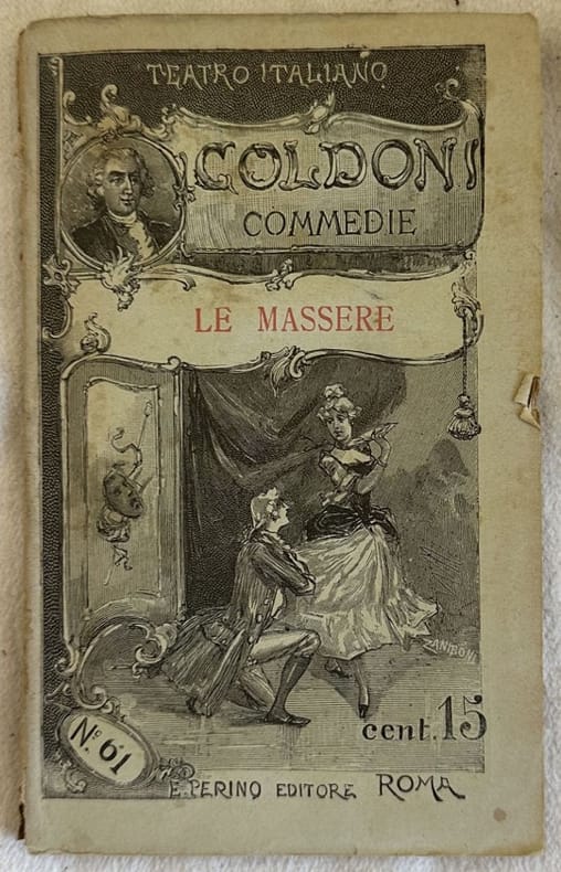 Edizione Perino del 1892 della commedia "Le masserie" di Carlo Goldoni della collana "Teatro italiano". Sono presenti due incisioni a piena pagina, una delle quali in antiporta. In buone condizioni. Copertina editoriale in discrete condizioni con lievi usure marginali. Legatura in discrete condizioni con lievi rotture. Pagine in buone condizioni generali con fioriture. Mancanza all'angolo superiore destro. In 16. Dim. 17,5x11 cm. Pp. 68.Perino edition of 1892 della commedia "Le masserie" by Carlo Goldoni of the series "Teatro italiano". Inside there are two engravings, one of them in the frontspice. In good conditions. Editorial cover in fair conditions lightly worn in the extremities. Binding in fair conditions with light cracks. Pages are in good conditions with foxing. In 16. Dim. 17,5x11 cm. Pp. 68.