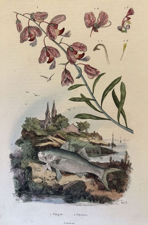 Incisione del 1839 colorata a mano che mostra un pesce gatto. Nell'incisione la pianta Poligala. Data: 1839 Autore: E. Guerin Tecnica: xilografia acquarellata a mano Dimensione del foglio: 280x180 mm Dimensione incisione: 210x135 mm Condizioni: Buone. Alcune fioriture. Nice woodcut of 1839 coloured by hand representing different species of cat fish. In the engraving the plant Poligala. Date: 1839 Author E. Guerin Technique: xilography painted by hand Size of the page: 280x180 mm Size of the engraving: 210x135 mm Conditions: Good conditions. Some foxing<BR><BR> <BR><BR>