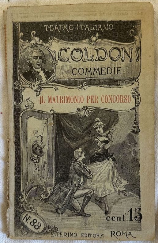 Edizione Perino del 1892 della commedia "Il matrimonio per concorso" di Carlo Goldoni della collana "Teatro italiano". Sono presenti due incisioni a piena pagina, una delle quali in antiporta. In buone condizioni. Copertina editoriale in discrete condizioni con lievi usure marginali. Legatura in discrete condizioni con lievi rotture. Pagine in buone condizioni generali con fioriture. In 16. Dim. 17,5x11 cm. Pp. 64.Perino edition of 1892 of the play "Il matrimonio per concorso" by Carlo Goldoni of the series "Teatro italiano". Inside there are two engravings, one of them in the frontspice. In good conditions. Editorial cover in fair conditions lightly worn in the extremities. Binding in fair conditions with light cracks. Pages are in good conditions with foxing. In 16. Dim. 17,5x11 cm. Pp. 64.
