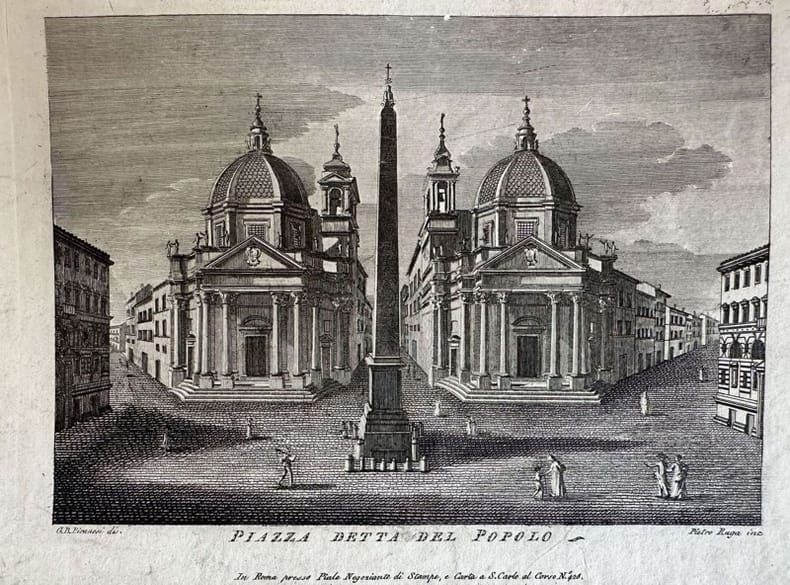 Veduta di Piazza del Popolo a Roma. Atlante: Raccolta di 50. Vedute Antiche e Moderne della città di Rome e sue vicinanze Data: 1810-1818 Autore: Pietro Riga su disegno di Giovanni Battista Piranesi Tecnica: incisione su rame Dimensione del foglio: 20x26 cm Dimensione incisione: 16x20,5 cm Condizioni: Buone. Alcune fioriture e lievi gore Alcuni fori.View of Piazza del Popolo in Rome. Atlas: Raccolta di 50. Vedute Antiche e Moderne della città di Rome e sue vicinanze Date: 1810-1818 Author: Pietro Riga after Giovanni Battista Piranesi Technique: Copper etching Leaf Dimension:20x26 cm Engraving Dimension: 16x20,5 cm Conditions: Good conditions. Some foxing.