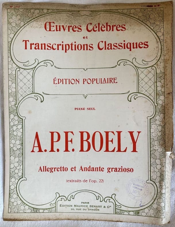Edizione di inizio novecento della melodia "Allegretto et Andante grazioso" del compositore francese Alexandre Pierre Francois Boely (1785-1858). In buone condizioni. Copertina editoriale in buone condizioni con lievi usure marginali. Strappo marginale. Legatura editorialmente assente. Pagine in buone condizioni con rare fioriture. In Folio. cm. 35x27. Pp. 5.Edition of early 20th century of the melody "Allegretto et Andante grazioso" by the french composer Alexandre Pierre Francois Boely (1785-1858). In good conditions. Editorial cover in good conditions lightly worn in the extremities. Tear in the edges. Binding is editoriarly missing. Pages in good conditions with occasional foxing. In Folio. cm. 35x27. Pp. 5.