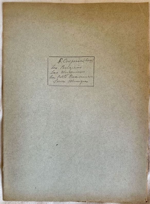 Edizione di inizio novecento di quattro melodie del compositore barocco Francois Couperin (1668-1733). All'interno: Les bergeries; Les moissenneurs; La petite pince-sans-rire. In buone condizioni. Copertina morbida in buone condizioni con lievi usure marginali. Legatura editorialmente assente. Pagine in buone condizioni con rare fioriture. Piegatura verticale. In Folio. cm. 35x27. Pp. 8. Edition of earlu 20th century by the baroque composer Francois Couperin (1668-1733). Inside: Les bergeries; Les moissenneurs; La petite pince-sans-rire. In good conditions. Soft cover in good conditions lightly worn in the extremities. Binding editoriarly missing. Pages in good conditions with occasional foxing. Vertical folding. In Folio. cm. 35x27. Pp. 8.