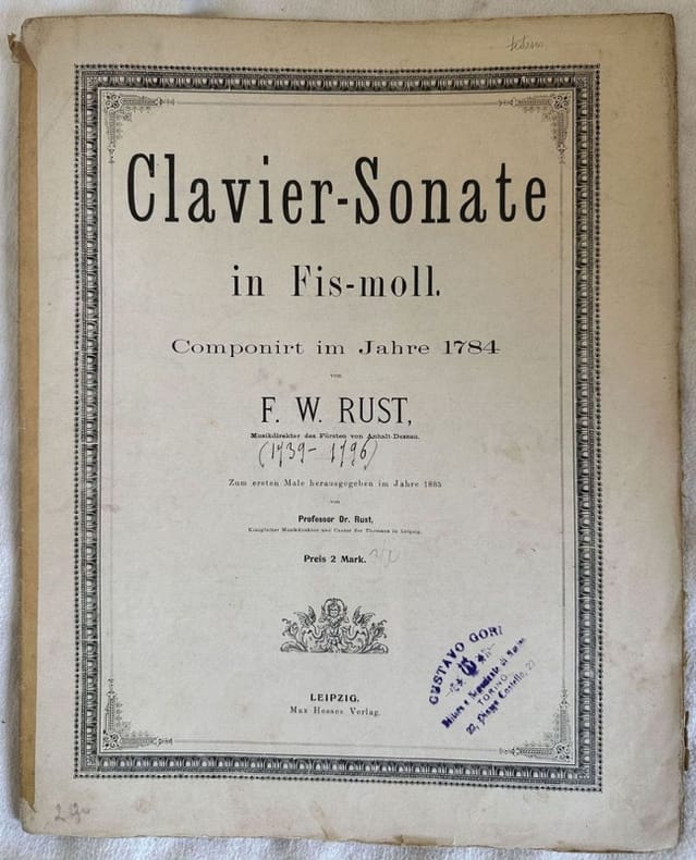 Edizione di fine ottocento della melodia "Sonate" di E. W. Rust (1739-1796). In discrete condizioni. Copertina editoriale in discrete condizioni con lievi usure marginali. Dorso coperto da carta. Legatura editorialmente assente. Pagine in buone condizioni con rare fioriture. In Folio. cm. 34x27. Pp. 15.Edition of late 19th century of the melody "Sonate" di E. W. Rust (1739-1796). In fair conditions. Editorial cover in fair conditions lightly worn in the extremities. Spine covered by paper. Binding is editoriarly missing. Pages in good conditions with occasional foxing. In Folio. cm. 34x27. Pp. 15.