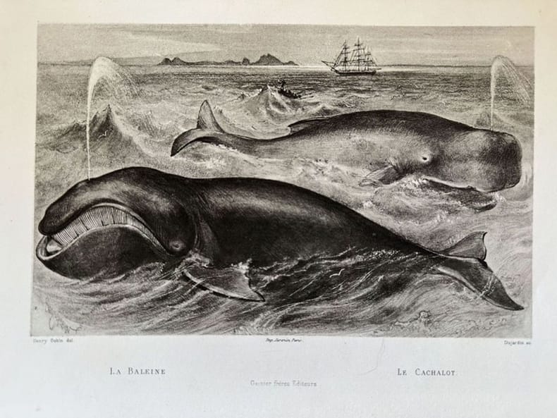 Incisione del 1880 circa che mostra una balena e un capodoglio. Data: 1880 circa Tecnica: Acquaforte Autore Dujardin su soggetto di Henry Gobin Dimensione del foglio: 275x180 mm Dimensione incisione: 185x115 mm Condizioni: Buone. Alcune fioriture.Engraving of 1880 circa representing a whale and a sperm whale. <BR> Date: 1880 circa Technique: etching Author: Dujardin after Henry Gobin Size of the page: 275x180 mm Size of the engraving: 185x115 mm Conditions: Good conditions. Some foxing
