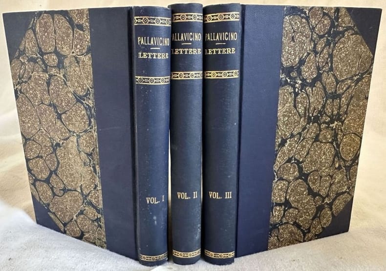 Edizione del 1848 di questa raccolta di lettere del Cardinale Francesco Maria Sforza Pallavicino (1607-1667). Volume appartenente alla collana "Biblioteca classica sacra o sia raccolta di opere religiose di celebri autori". L'opera era composta da quattro tomi siamo in possesso dei primi tre. Le lettere del Cardinale Sforza vennero pubblicate dal suo ex segretario Giambattista Galli Pavarell l'anno dopo la sua morte. Segnalibro in seta celeste. In ottime condizioni. Copertina in mezza tela con titolo e decorazioni in oro al dorso in ottime condizioni generali con lievi usure ai margini e dorso. Legatura in ottime condizioni. Pagine in ottime condizioni con rare fioriture. In 16. Dim. 16,5x11 cm. Pp. 268+(1), 255+(1), 262+(1). Peso Kg. 0,740 Edition of 1848 of this collection of letters by the Cardinal Francesco Maria Sforza Pallavicino (1607-1667). Volume belonging to the series "Biblioteca classica sacra o sia raccolta di opere religiose di celebri autori". The work was made up of four tomes, we only have the first three tomes. The letters were published by his segretary the year after his death. Bookmark in light blue colour. In very good conditions. Half cloth cover with gilted title and decorations in the spine in very good conditions lightly worn in the extremities. Binding in very good conditions. Pages in very good conditions with occasional foxing. In 16. Dim. 16,5x11 cm. Pp. 268+(1), 255+(1), 262+(1). Peso Kg. 0,740