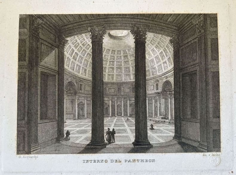Finissima veduta animata dell'interno del Pantheon inciso da Giovanni Acquaroni attivo nella prima metà del XIX secolo. nel 1826 firmò un contratto con la stamperia Antonelli per l'Interno del Pantheon. Opera che lo rese celebre all'estero. Autore: Giovanni Acquaroni (1800 ca-1874) Data: 1826 Tecnica: Acquaforte Dimensione del foglio: 29x22 cm Dimensione incisione: 19x14,5 cm Condizioni: Buone. Alcune fioriture.Very fine animated view of the internal of Pantheon engraved by Giovanni Acquaroni active in the first half of XIX century. In 1826 he signed a contract in the editor Antonelli for the internal of Pantheon. This work made his famous outside Italy. Author: Giovanni Acquaroni (1800 ca-1874) Date: 1826 Technique: Etching Leaf Dimension:29x22 cm Engraving Dimension: 19x14,5 cm Conditions: Good conditions. Some foxing.