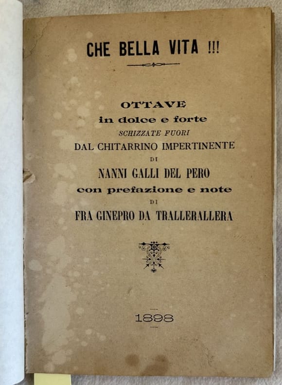 Raro opuscolo del 1898, una serie di rime di Nanni Galli del Pero Prefazione e note di Fra Ginepro da Trallerallera. Tra le rime: Socialismo, Parodia del cinque maggio, Diesilla ecc... In buone condizioni. Copertina morbida moderna in ottime condizioni generali. Legatura in buone condizioni . All'interno le pagine si presentano in buone condizioni con fioriture. In 16. Dim. 15,5x11 cm. Pp. X+70. Scarce pamphlet of 1898 a series of rhymes by Nanni Galli del Pero. Prefation and notes by Fra Ginepro da Trallerallera. the rhymes inside: Socialismo, Parodia del cinque maggio, Diesilla ecc... In good conditions. Soft modern cover in very good conditions lightly worn in the extremities. Binding in good conditions. Inside pages are in good conditions with foxing.In 16. Dim. 15,5x11 cm. Pp. X+70.