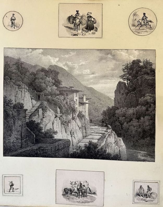 Veduta litografica di un paesaggio di montagna incollata su un foglio insieme ad altre piccole incisioni. Autore: Engelmann su disegno di Villeneuve Data: 1824 Tecnica: Litografia Dimensione del foglio: 30x26 cm Dimensione incisione: 15,5x21,5 cm Condizioni: Buone. Alcune fioriture.Lyhtographic view of a mountain view attached on a leaf together with other little engravings. Author: Engelmann after Villeneuve Date: 1824 Technique: Lithography Leaf Dimension:30x26 cm Engraving Dimension: 15,5x21,5 cm Conditions: Good conditions. Some foxing.