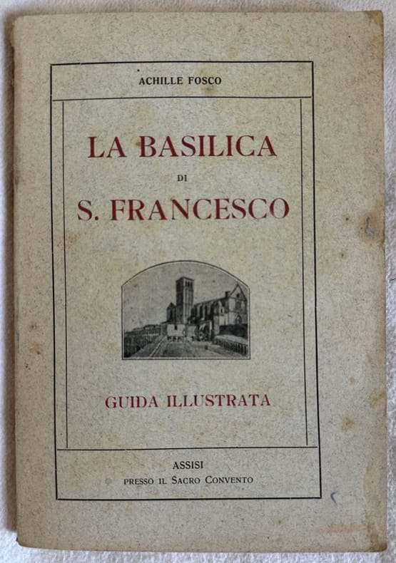 Edizione del 1923 di questa guida illustrata alla Basilica di San Francesco scritta da Padre Achille Fosco. Alcune foto all'interno: Panorama di Assisi, San Francesco dalla Rocca, vari dettagli delll'esterno e interno della Basilica. Mappa nel testo. All'interno la storia e descrizione molto dettagliata della Basilica. Appendice: Stalletta dove nacque San Francesco; Santuario di Rivotorto; Cenno storico su Rivotorto In buone condizioni. Copertina editoriale in buone condizioni generali con lievi usure ai margini e dorso. Legatura in discrete condizioni con lievi rotture. All'interno le pagine si presentano in buone condizioni con fioriture. In 16. Dim. 17x11,5 cm. Pp. 135+(1). Edition of 1923 of this illustrated guide to the Basilica di San Francesco written by the Father Achille Fosco. Some photoes inside: Panorama di Assisi, San Francesco dalla Rocca, vari dettagli delll'esterno e interno della Basilica. Map in the text. Inside the history and very detailed description of Basilica. Appendix: Stalletta dove nacque San Francesco; Santuario di Rivotorto; Cenno storico su Rivotorto. In good conditions. Editorial cover in good conditions lightly worn in the extremities. Binding in fair conditions with light cracks. Inside pages are in good conditions with foxing. In 16. Dim. 17x11,5 cm. Pp. 135+(1).