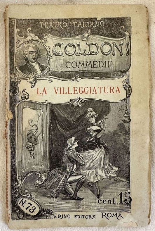 Edizione Perino del 1892 della commedia "La villeggiatura" di Carlo Goldoni della collana "Teatro italiano". Sono presenti due incisioni a piena pagina, una delle quali in antiporta. In mediocri condizioni. Copertina editoriale in discrete condizioni con lievi usure marginali. Piatto anteriore in parte staccato. Legatura in buone condizioni. Pagine in buone condizioni generali con fioriture. In 16. Dim. 17,5x11 cm. Pp. 64.Perino edition of 1892 off the play "La villeggiatura" by Carlo Goldoni of the series "Teatro italiano". Inside there are two engravings, one of them in the frontspice. In poor conditions. Editorial cover in fair conditions lightly worn in the extremities. Front plate partially detached. Binding in good conditions. Pages are in good conditions with foxing. In 16. Dim. 17,5x11 cm. Pp. 64.