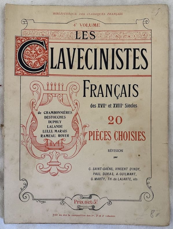 Edizione della fine dell'ottocento o primi del novecento di questa raccolta di pezzi di vari compositori del XVII e XVIII secolo rivisti per pianoforte da Saint Saens, Vicnent D'Indy, Paul Dukas, A. Guilmant, G. Marty, Th. de Lajarte. <BR><BR>All'interno pezzi di: De Chambonnieres, Destouches, Duphly, Lalande, Lulli, Marais, Rameau, Royer.<BR><BR>In discrete condizioni.<BR><BR>Copertina editoriale in mediocri condizioni con lievi usure marginali. Legatura in mediocri condizioni con rotture. Pagine in buone condizioni con rare fioriture. In Folio. cm. 30,5x23. Pp. (4)+62.Edition of late 19th century or early 20th century of this collection of different composers of XVII and XVIII century reviewed for the piano by Saint Saens, Vicnent D'Indy, Paul Dukas, A. Guilmant, G. Marty, Th. de Lajarte. <BR><BR>Inside pieces of: De Chambonnieres, Destouches, Duphly, Lalande, Lulli, Marais, Rameau, Royer. In fair conditions. Editorial cover in poor conditions lightly worn in the extremities. Binding in poor conditions with cracks. Pages in good conditions with occasional foxing. In Folio. cm. 30,5x23. Pp. (4)+62.