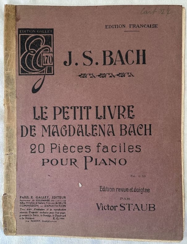 Edizione degli anni '20 di questa raccolta di venti melodie composte dal 1722 al 1725 dal compositore tedesco Johann Sebastian Bach (1685-1750) rivisto da Victor Staub.<BR>In discrete condizioni Copertina editoriale in discrete condizioni con lievi usure marginali. Dorso ricoperto da carta. Legatura in discrete condizioni. Pagine in buone condizioni con rare fioriture. In folio. cm. 31,5x24. Pp. 16Edition of 1920's of this collection of twenty melodies composed by from 1722 to 1725 by the german composer Johann Sebastian Bach (1685-1750) reviewed by Victor Staub. In fair conditions Editorial cover in fair conditions lightly worn in the extremities. Spine covered by paper. Binding in fair conditions. Pages in good conditions with occasional foxing. In folio. cm. 31,5x24. Pp. 16.