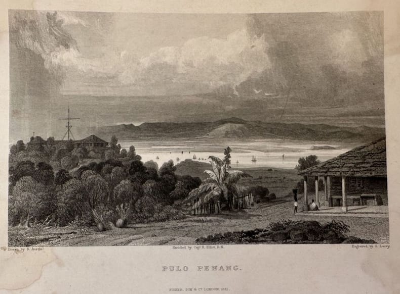 Veduta animata dell'isola di Pulo Penang vista dall'attuale Penisola della Malesia lungo lo Stretto di Malacca. Autore: S. Lacey su disegno di S. Austin Data: 1831 Tecnica: Acquaforte Dimensione del passepartout: 17,5x24,5 cm Dimensione incisione: 18,5x11,5 cm Condizioni: Buone. Alcune fioriture.Gore d'umidità.Animated view of the island of Pulo Penang viewed from the present day Peninsula of Malaysia across the Straits of Malacca. Author: S. Lacey after S. Austin Date: 1831 Technique: Etching Leaf Dimension: 17,5x24,5 cm Engraving Dimension: 18,5x11,5 cm Conditions: Good conditions. Some foxing. Some dump stains.