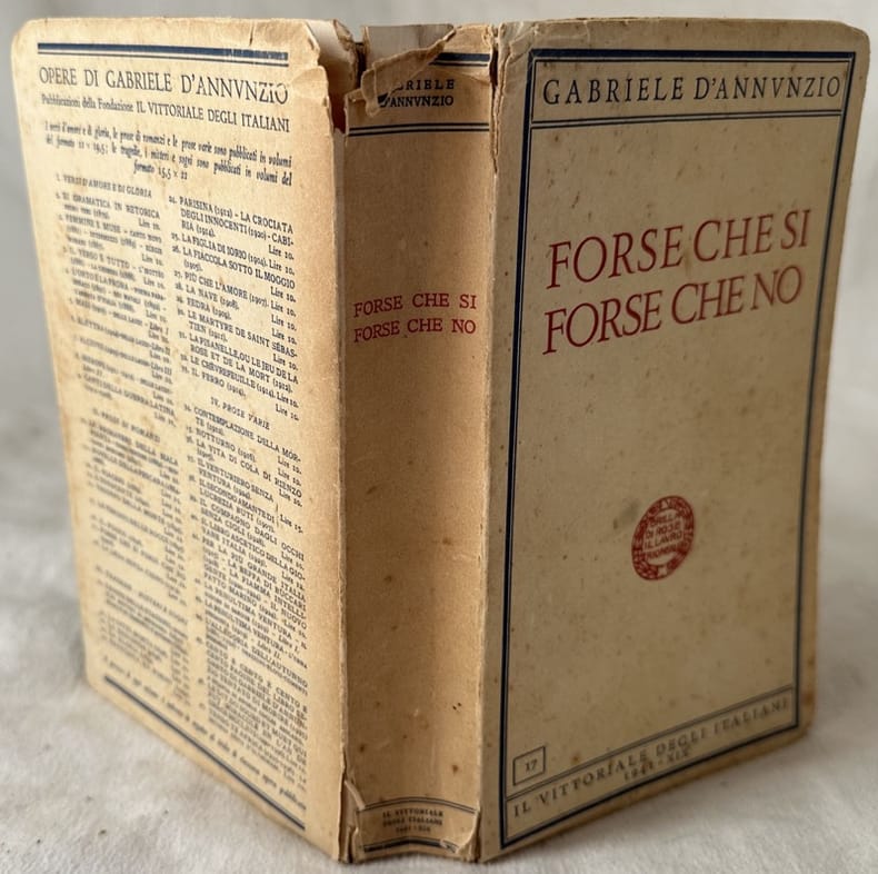 Edizione del 1941 n. 17 della collana "Il Vittoriale degli italiani" del romanzo "Forse che si forse che no" dello scrittore, poeta, drammaturgo, politico e gionalista Gabriele D'Annunzio (1863-1938). Il romanzo è ambientato nel mondo dell'aviazione. In buone condizioni. Brossura editoriale in buone condizioni generali con lievi usure ai margini e dorso. Legatura in buone condizioni. All'interno le pagine si presentano in buone condizioni con fioriture. In 8. cm. 20,5x12,5. Pp. 550+(1).Edition of 1941 of the series "Il Vittoriale degli italiani"of the novel "Forse che si forse che no" byt he writer, poet, dramawriter, politician and journalist Gabriele D'Annunzio (1863-1938). The novel is placed in the world of aviation. Signature dated 14th of October 1918 in the page of dedication. In good conditions. Editorial cover in good general conditions lightly worn in the extremities. Binding in good conditions. Inside pages are in good conditions with foxing.In 8. cm. 20,5x12,5. Pp. 550+(1).