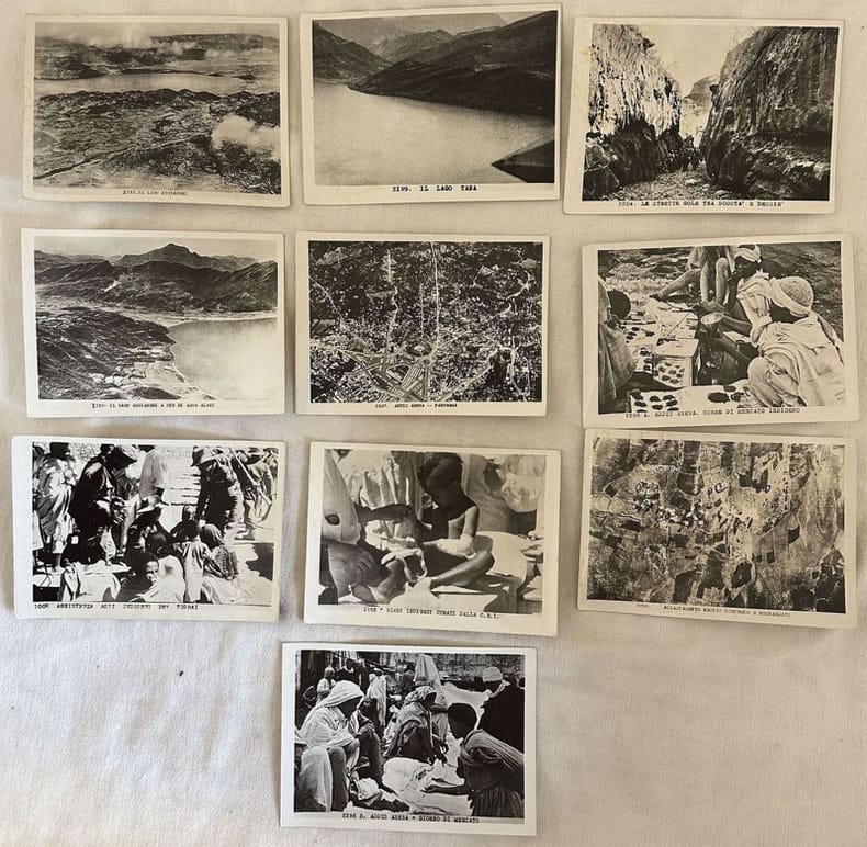 Raccolta di dieci foto copie di fotografie realizzate nel 1936 circa nella Etiopia italiana. Queste fotografie sono riproduzioni delle originali e sono state realizzate verso gli anni '70, '80. Riproducono paesaggi e momenti storici: Il Lago Ascianghi a sud di Amba Alagi; Assistenza agli indigeni del Tigrai; Addis Abeba giorno di mercato; Bimbi indigeni curati dalla C.R.I.; Accampamento nemico sorpreso e bombardato; Addis Abeba scene di un mercato indigeno; Le strette gole tra Socotà e Dessiè; Il Lago Tana; Addis Abeba panorama. Dim. cm 13x18. In buone condizioni. Il governo fascista instituì nel settembre 1935 il "Reparto foto-cinematografico per Africa Orientale" con il compito di raccogliere materiale fotografico e cinematografico sull'Africa Orientale durante il periodo 1935-38. Ogni foto riportava indicazione dattiloscritte con indice della serie, elenco degli avvenimenti, numero di inventario. Oggi tutto questo materiale è conservato nel fondo dell'Istituto Luce.Collection of ten photoes of photographies realized in 1936 circa in Etiopia italiana. These photographies are reproductions of the originals and have been realized in 1970's 80's circa. They reproduce views and historical moments: Il Lago Ascianghi a sud di Amba Alagi; Assistenza agli indigeni del Tigrai; Addis Abeba giorno di mercato; Bimbi indigeni curati dalla C.R.I.; Accampamento nemico sorpreso e bombardato; Addis Abeba scene di un mercato indigeno; Le strette gole tra Socotà e Dessiè; Il Lago Tana; Addis Abeba panorama. Dim. cm 13x18. In good conditions. The fascist government created in september 1935 the "Reparto foto-cinematografico per Africa Orientale" with the duty to collect photographic and cinematographic material about Africa Orientale during th period 1935-38. Each photo indicates typewritten indication with index of series, list of happenings, number of inventary. Today all this material is preserved in the archive of Istituto Luce.<BR><BR>