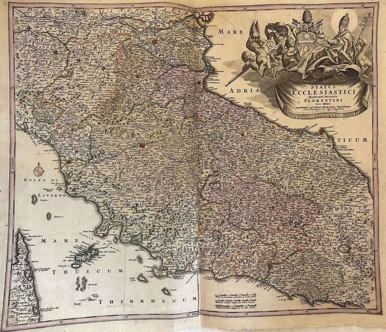 AUTORE: Johann Baptist Homann (1633-1723) TITOLO: Status Ecclesiastici magnique Ducatus Florentini representata a Io. Bapt. Homanno Norimbergae Dimensioni del foglio: 530 x 620 mm. Dimensioni dell'incisione: 485 x 570 mm. Tecnica: incisione su rame colorata a mano Condizioni generali: Ottime rare fioriture. Piccolissimo foro di tarlo in alto a sinistra che non inficia il testo. Piccola parte mancante al margine superiore. Meravigliosa mappa del centro Nord Italia (Granducato di Toscana, Stato Ecclesiastico) stampata nel 1720 dal cartografo Johann Baptist Homann (1633-1723) attivo a Norimberga. Homann lavorò inizialmente per David Funk e Giacomo Sandrart per poi pubblicare nel 1707 il suo primo atlante "Grosser Atlas". La mappa mostra una particolare cura nella rappresentazione delle coste e nella toponomastica. Cartiglio molto elaborato. Antiche note manoscritte al verso. Di grandi dimensioni. AUTHOR: Johann Baptist Homann (1633-1723) Title: Status Ecclesiastici magnique Ducatus Florentini representata a Io. Bapt. Homanno Norimbergae Sheet size: 530 x 620 mm. Plate area: 485 x 570 mm. Technique: Copper engraving Overall condition: Very good condition, with light foxing. Very little worming hole without losing text. little missing part in the upper edge Wonderful map of Central Northern Italy (Granducato di Toscana, Stato Ecclesiastico) published in 1720 by the cartographer Johann Baptist Homann (1633-1723) active in Norimberga. Homann initially worked for David Funk and Giacomo Sandrart then published in 1707 his first atlas "Grosser Atlas". Coasts and toponomastics are carefully represented. Very decorated cartouche. Antique handwritten notes in the verso. Of big size.