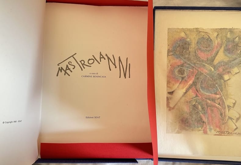 Edizione del 1985 pubblicata in 2000 esemplari di questo volume sullo scultore e pittore Umberto Mastroianni. Il nostro esemplate è il numero 1194. Nella prima parte testo a cura di Carmine Benincasa. Seguono ventisei (su 37) tavole a colori protette da venila in simil tessuto. Risultano mancanti le seguenti tavole: 2, 3, 4, 6, 9, 10, 13, 20, 31, 36, 37. Il testo e le tavole sono contenute all'interno di un cofanetto in piena tela con incisione della firma dell'artista al piatto. In buone condizioni. Dim. cm 55x40. pp. 24+(8)+26 tav. Peso Kg. 4,100.Edition of 1985 published in 2000 copies of this volume about the culptor and painter Umberto Mastroianni. Our copy is the number 1194. In the first part etxt by Carmine Benincasa. Then 26 (on 37) coloured plates protected by tissue paper. The following plates lack: 2, 3, 4, 6, 9, 10, 13, 20, 31, 36, 37. The text and plates are contained inside a cloth case with signature of the artist engraved in the front plate. In good conditions. Dim. cm 55x40. pp. 24+(8)+26 tav. Weight Kg. 4,100.