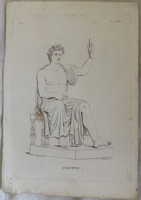 Bella acquaforte che mostra una scena storica: Augusto. Data: 1839/40 circa Autore: Saverio Pistolesi su disegno di Luigi Angelini Tecnica: acquaforte Dimensione del foglio: 26,5x18,5 cm Dimensione dell'incisione: 22,5x16 cm Condizioni: Buone. Alcune fioriture e gore d'umidità. Nice etching showing an historical scene: Augusto Date: 1839/40 circa Author: Saverio Pistolesi after Luigi Angelini Technique: etching Size of the page: 26,5x18,5 cm Size of the engraving: 22,5x16 cm Conditions: Good conditions. Some foxing and dump stains
