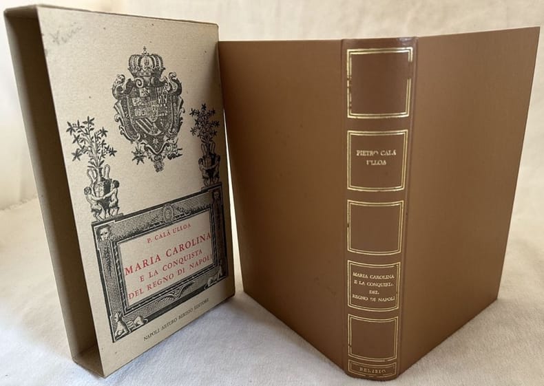 Edizione del 1968 di questa monografia su Maria Carolina e la conquista del Regno di Napoli di Calà Ulloa.<BR><BR>Traduzione di Ulrico Pannuti.<BR><BR>Saggio introduttivo di Antonio Rosada. <BR><BR>All'interno: Pietro Ulloa ultimo borbonico, Napoli e la terza coalizione, Maria Carolina contro l'egemonia francese, Condizioni del rEgno di Napoli agli inizi del secolo XIX, Continuazione della guerra in Italia, Esaurimento delle finanze, Piani dell'Inghilterra, Insolenze dell'Ambasciatore, Il Generale Lascy a Napoli, Lettere dell'Imperatore ai sovrani di Napoli, Colloquio della Regina con Alquier, ecc... In ottime condizioni. Copertina in pelle editoriale in ottime condizioni con lievi usure marginali. Cofanetto editoriale. Legatura in ottime condizioni. Pagine in ottime condizioni generali con rare fioriture. In 8. Dim. 22x14,5 cm. Pp. 497+(3).Edition of 1968 of this monography about Maria Carolina and the conquer of Reign of Naples written by Calà Ulloa Translation by Ulrico Pannuti. Introductive essay by Antonio Rosada. Inside: Pietro Ulloa ultimo borbonico, Napoli e la terza coalizione, Maria Carolina contro l'egemonia francese, Condizioni del rEgno di Napoli agli inizi del secolo XIX, Continuazione della guerra in Italia, Esaurimento delle finanze, Piani dell'Inghilterra, Insolenze dell'Ambasciatore, Il Generale Lascy a Napoli, Lettere dell'Imperatore ai sovrani di Napoli, Colloquio della Regina con Alquier, ecc... In very good conditions. Editorial leather cover in very good conditions lightly worn in the extremities. Editorial case. Binding in very good conditions. Pages are in very good conditions with occasional foxing. In 8. Dim. 22x14,5 cm. Pp. 497+(3).