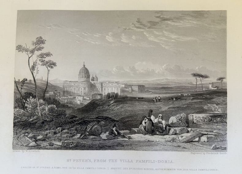 Veduta della Basilica di San Pietro da Villa Pamphili Doria. Atlante: Rome and its surrounding scenery Autore: Frederick Smith su disegno di W. L. Leitch Data: 1840 circa Tecnica: Litografia Dimensione del foglio: 27,5x20,5 cm Dimensione incisione: 18x12 cm Condizioni: Buone. Alcune fioritureView of the Basilica of San Pietro from Villa Pamphili Doria. Atlas: Rome and its surrounding scenery Author: Frederick Smith after W. L. Leitch Date: 1840 circa Technique: Lithography Leaf Dimension:27,5x20,5 cm Engraving Dimension: 18x12 cm Conditions: Good conditions. Some foxing.